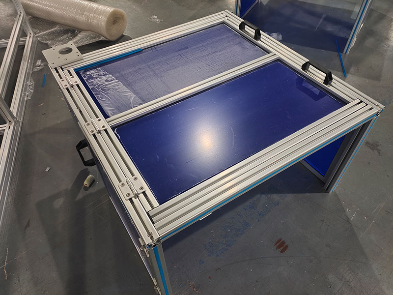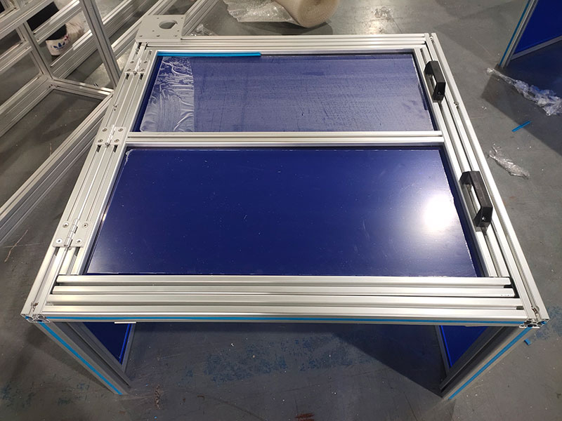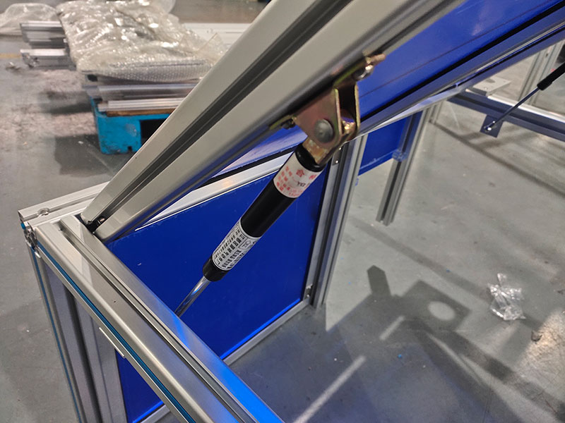 這個鋁型材設(shè)備防護(hù)罩頂部蓋板可以打開一個角度并固定住,也可以輕輕蓋上。實(shí)現(xiàn)這一功能的是蓋板上安裝的氣彈簧。氣彈簧又被稱為支撐桿、氣支撐、調(diào)角器、氣壓棒、阻尼器等,是一種可以實(shí)現(xiàn)支撐、緩沖、制動、高度及角度調(diào)節(jié)等功能的零件,在工程機(jī)械中,主要應(yīng)用于罩蓋、門等部位。